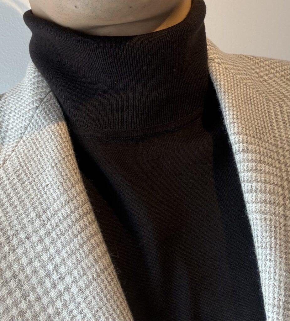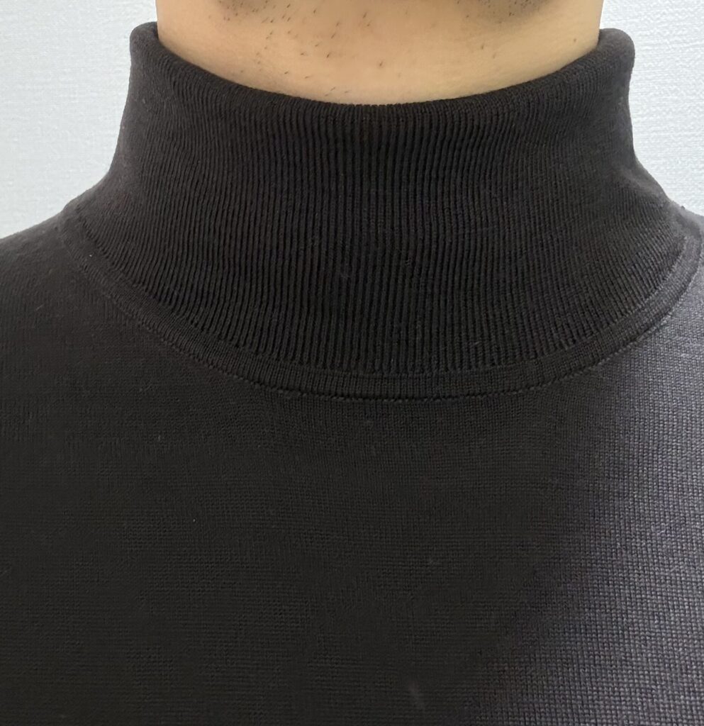 対してタートルネックのニットは、折り返す前提でモックネックよりは首部分が薄め(首以外と同じ薄さ)になっていることが多く、二重になって初めて成立する薄さなのだと思います。