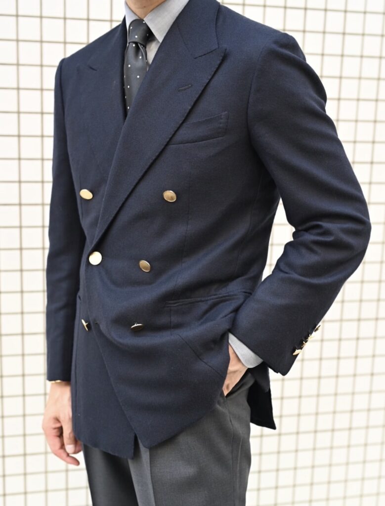 ですがその肝心の理由を聞き忘れてしまいました。ダブルはただでさえ重厚感があるから、着丈はやや軽めにした方がバランスが取れるから?(私の推測です)