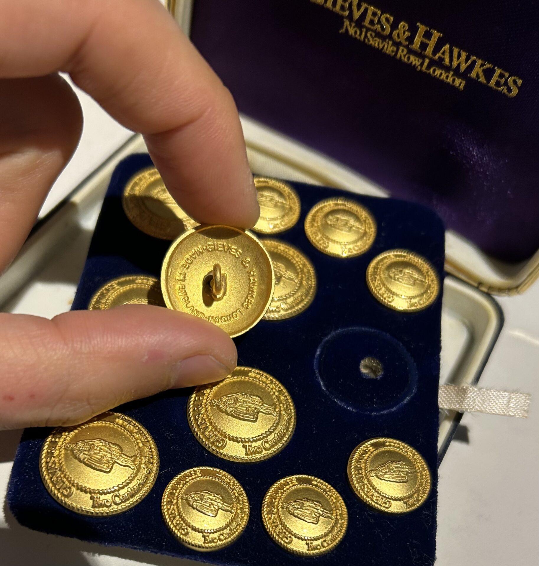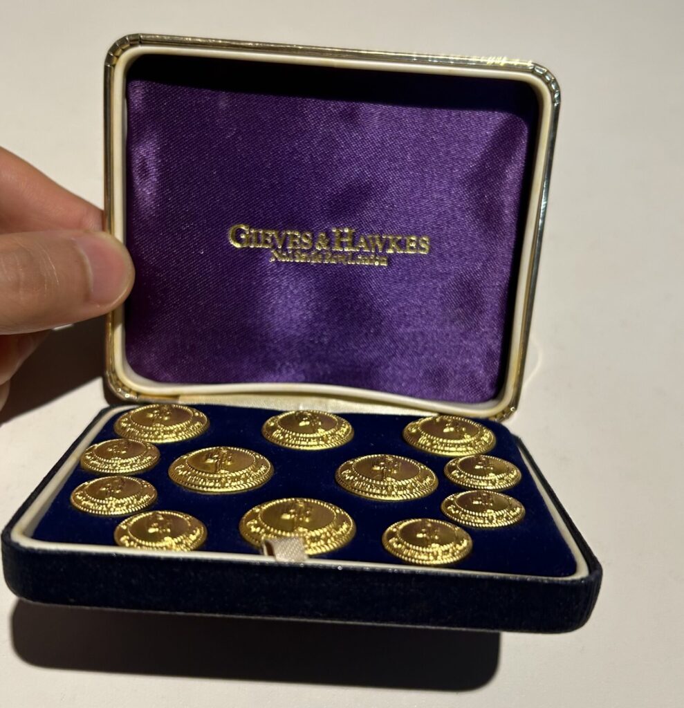 GIEVES & HAWKES と書いてあります。サヴィルロウにある老舗テーラーのことで、同テーラーがロンドンバッジに依頼して作ってもらったものでしょうか。