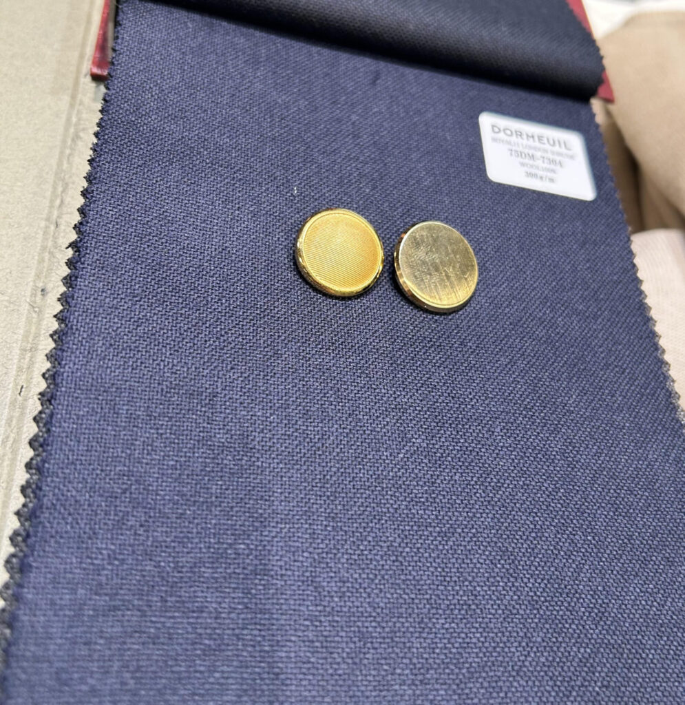 DORSOで作るブレザーなのに、別のテーラーの名前が入ったボタンを付けるのはどうなのか、という気もしましたが、文字なんてどうせ見えないので気にしないようにします。