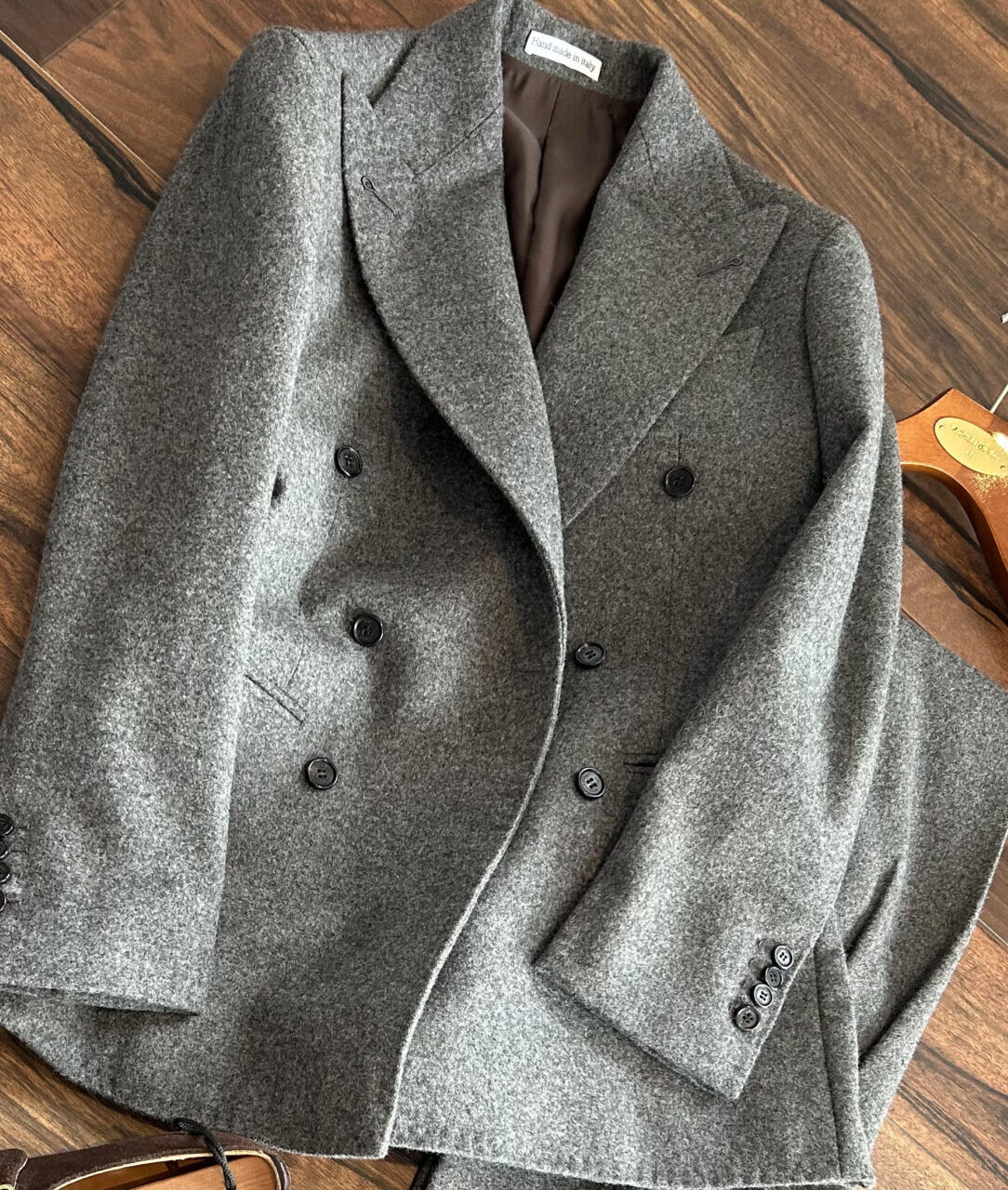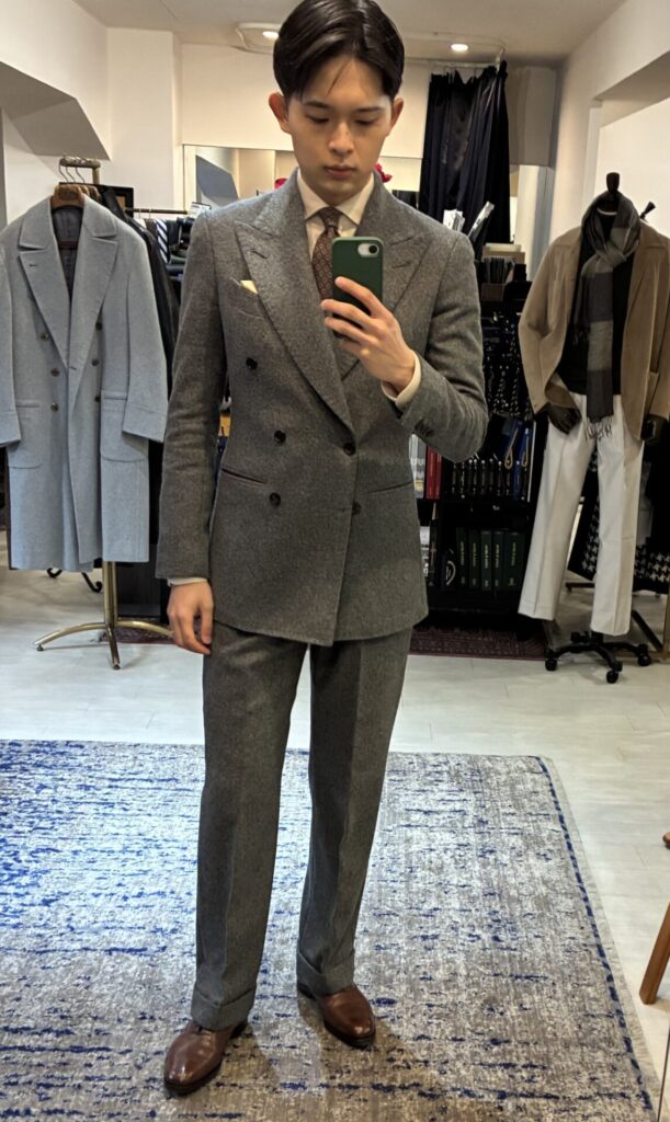 人生で初めて注文したミディアムグレーのスーツが、フォックスブラザーズの大定番のグレーフランネルのダブルのスーツ。