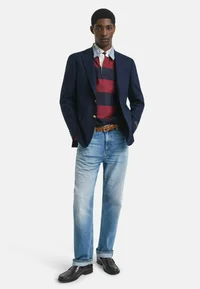 金ボタンの紺ブレに最も合うインナーは?と考えると、相性の良いものは無限にあります。