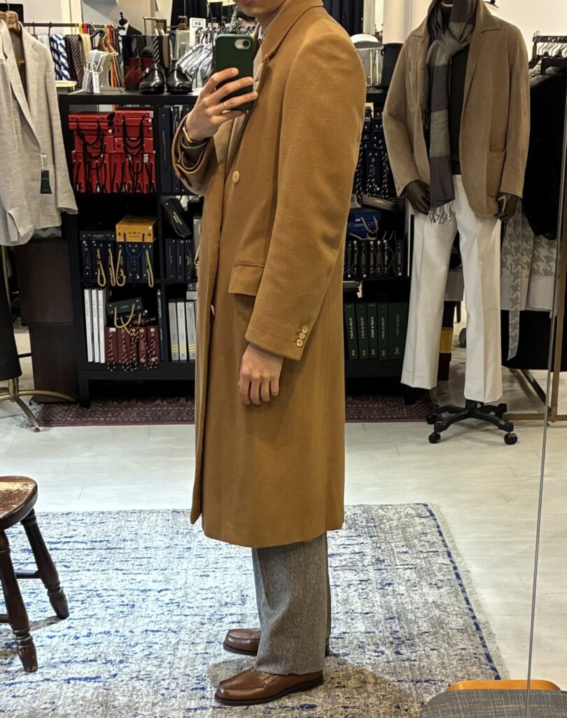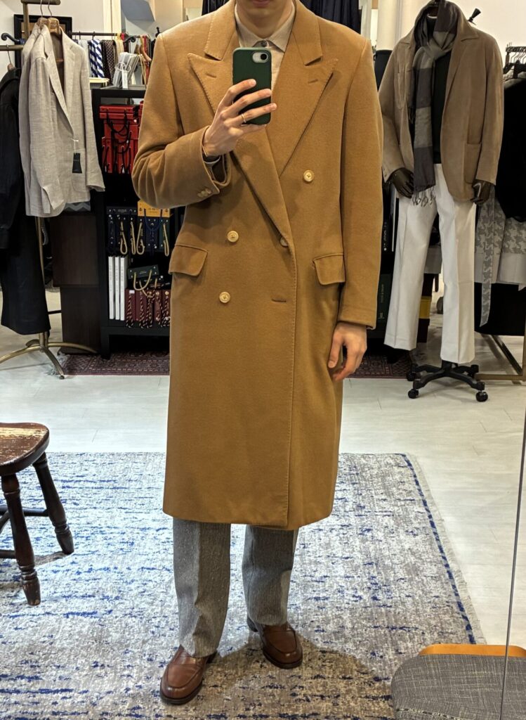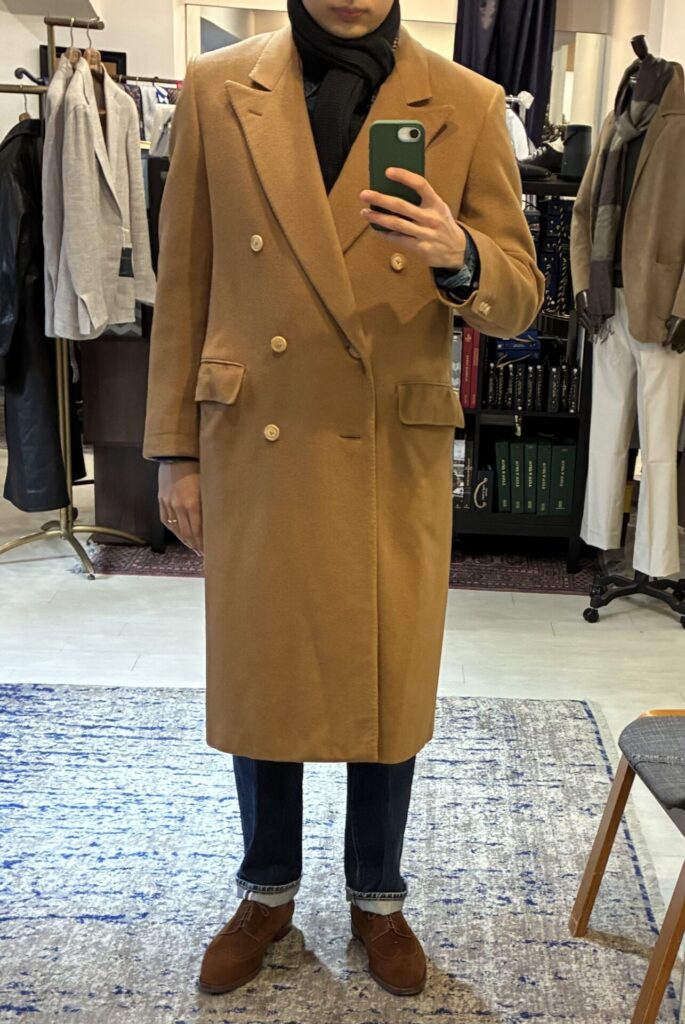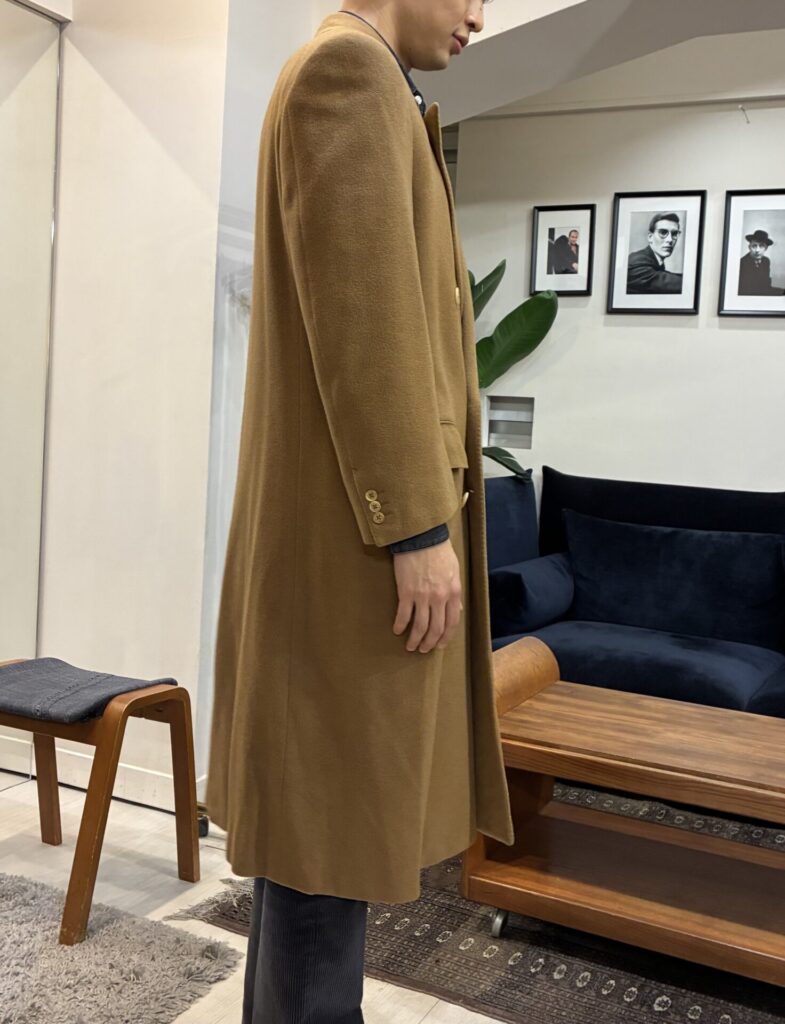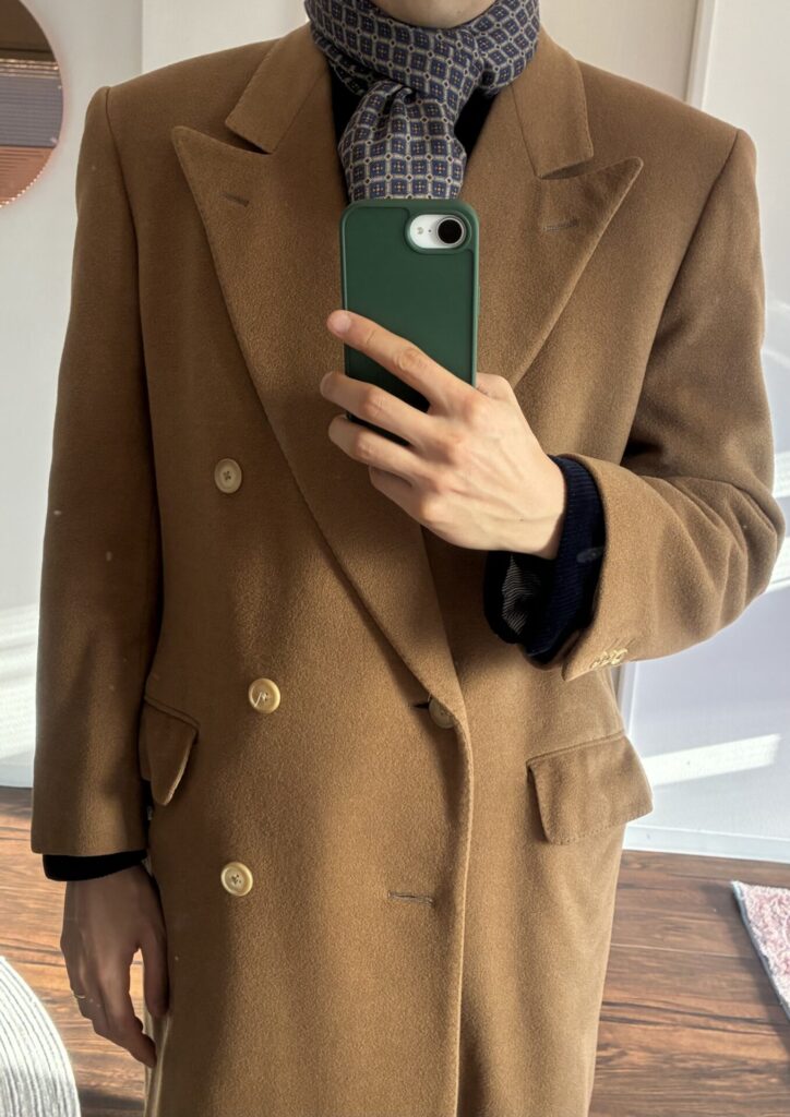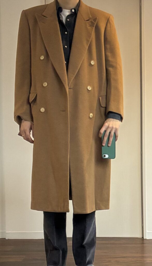 ある日、いつもの日課として古着市場を漁っていたところ、ヴィンテージのカシミヤ100%のコート、私の狙っていたキャメルカラーのものを見つけました。ゴージラインの低さもクラシックで、丈も長そうで、ビビッときました。