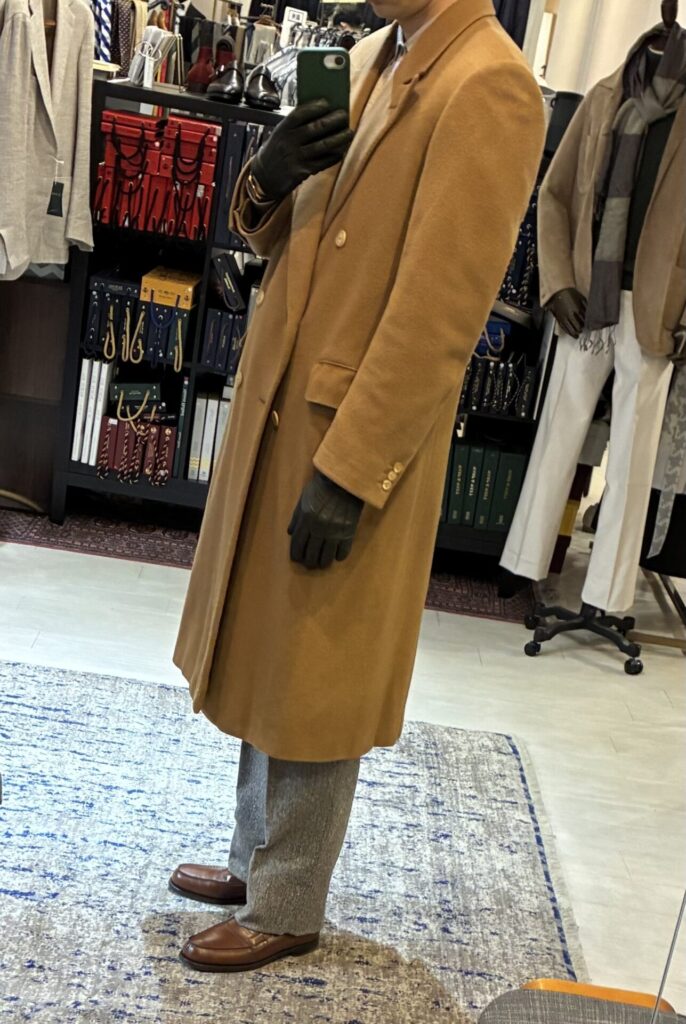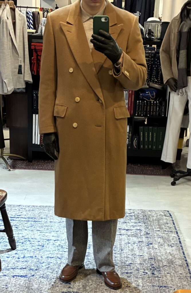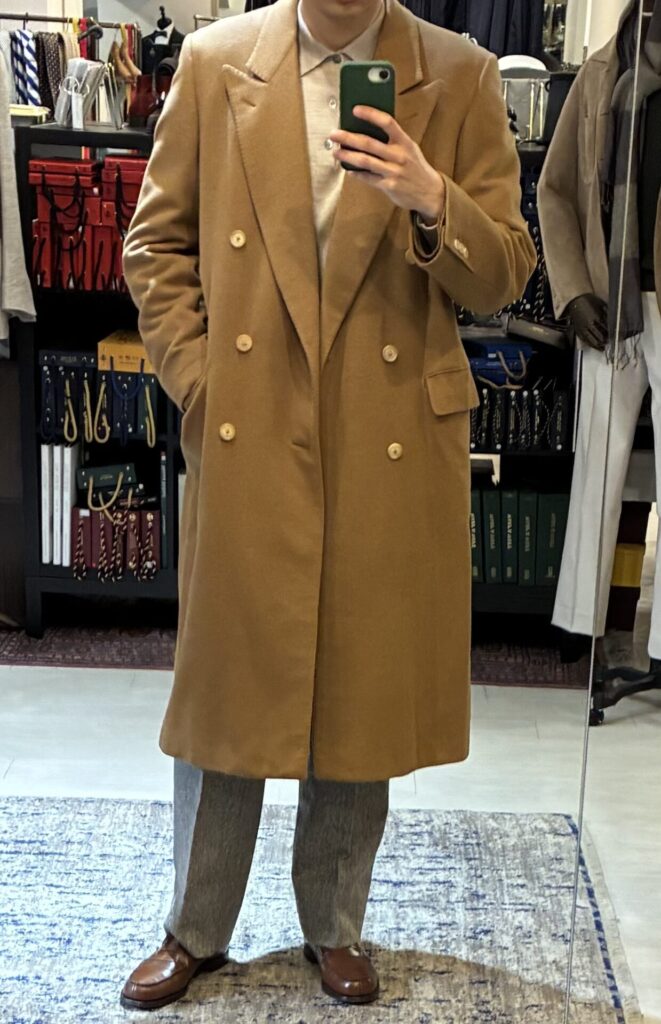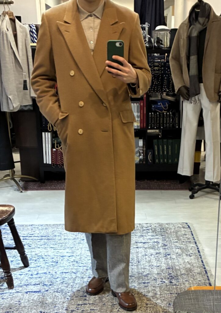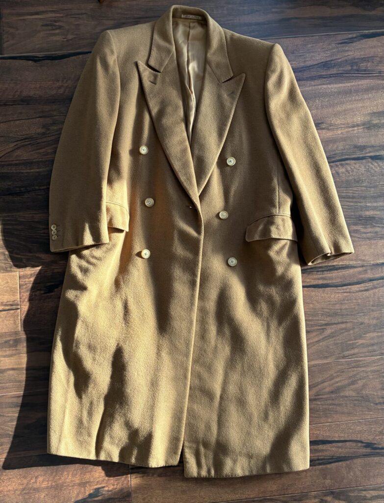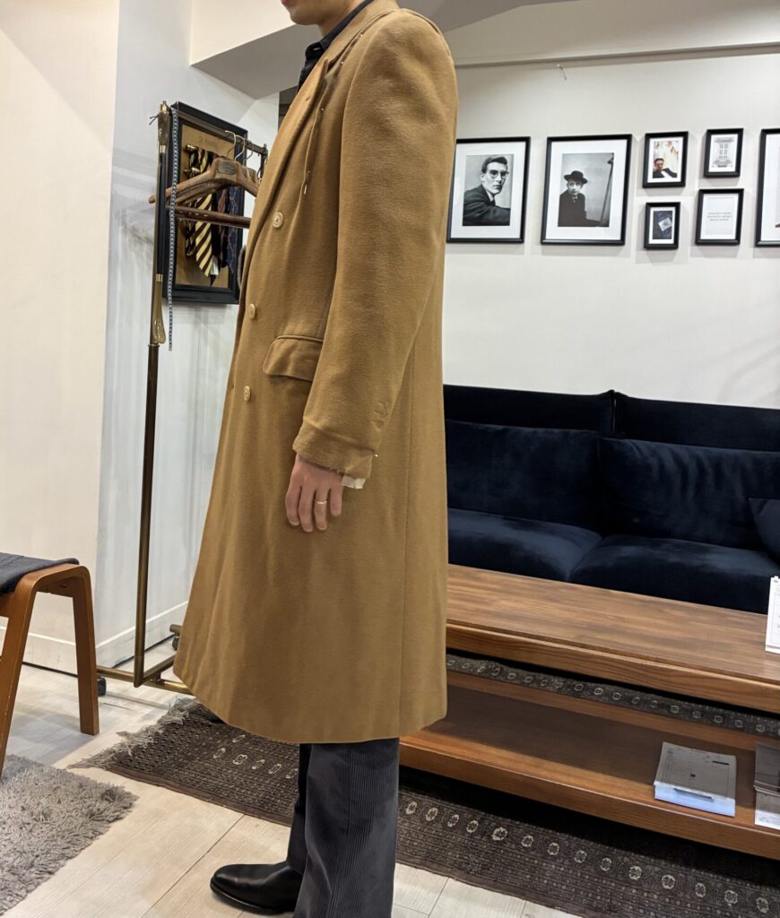 ある日、いつもの日課として古着市場を漁っていたところ、ヴィンテージのカシミヤ100%のコート、私の狙っていたキャメルカラーのものを見つけました。ゴージラインの低さもクラシックで、丈も長そうで、ビビッときました。