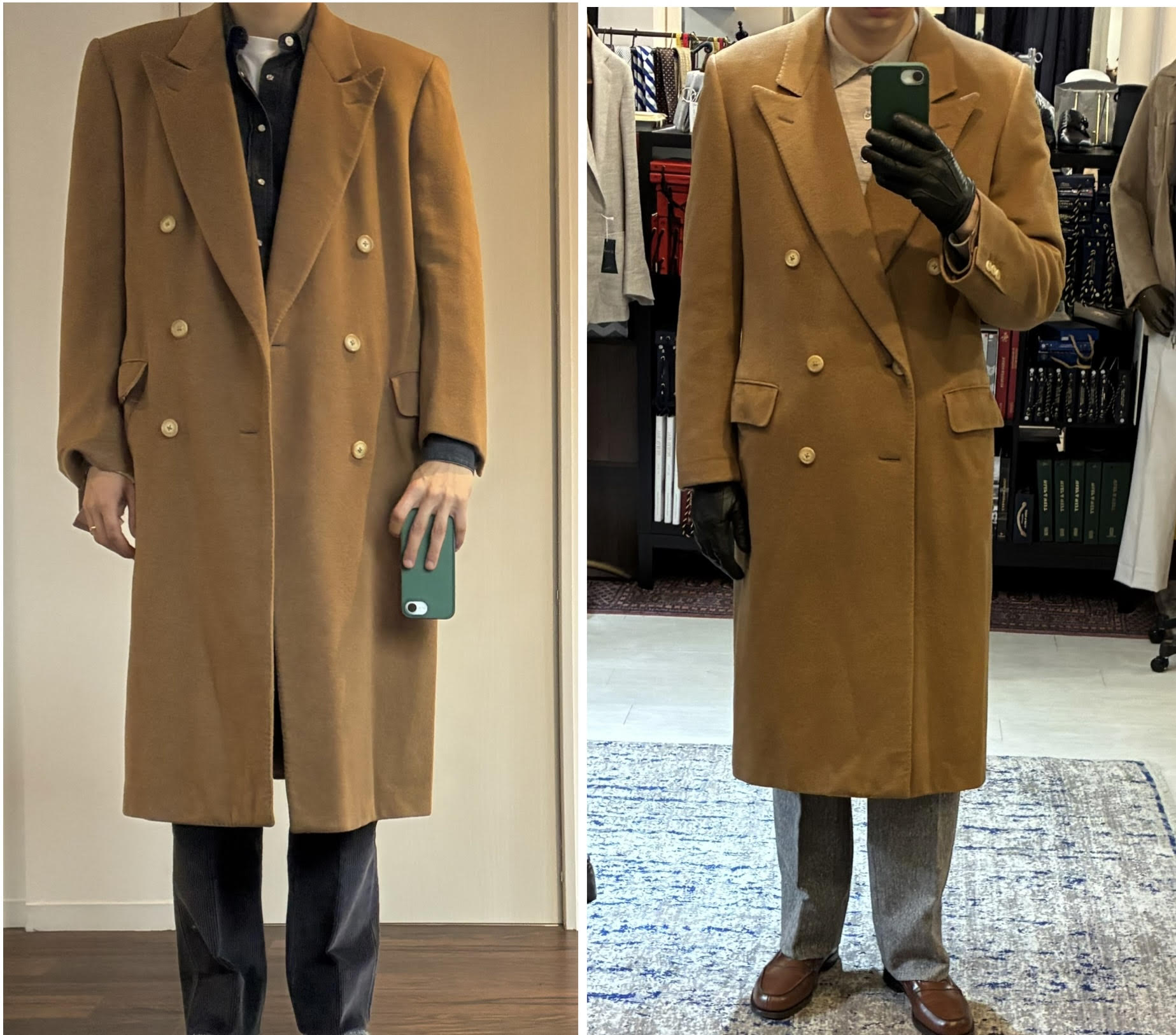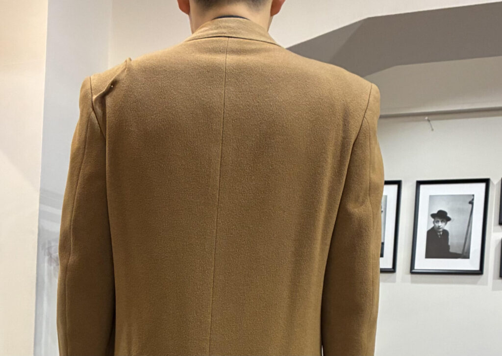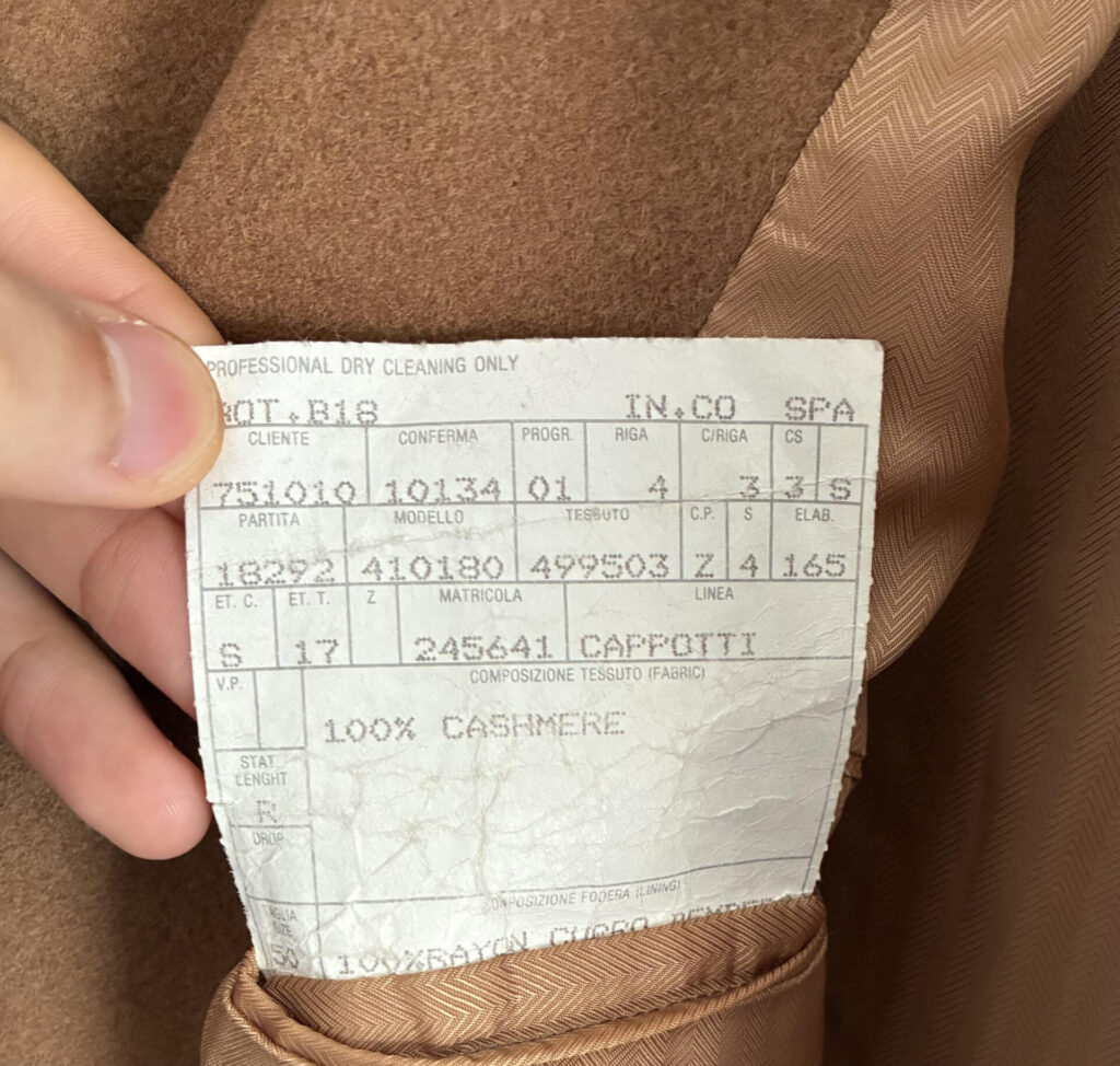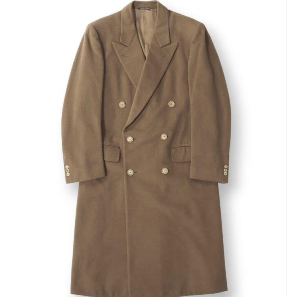 ある日、いつもの日課として古着市場を漁っていたところ、ヴィンテージのカシミヤ100%のコート、私の狙っていたキャメルカラーのものを見つけました。ゴージラインの低さもクラシックで、丈も長そうで、ビビッときました。