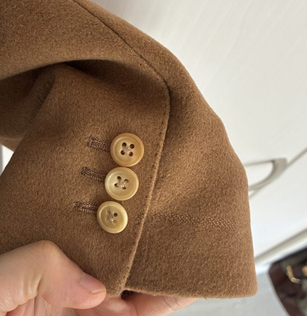 ・袖のボタンは、一番下だけ本切羽、上の2つは開き見せにしました。(将来的にターンナップ仕様にする=穴を閉じる可能性も視野に入れて、上の方までは穴を開けない方が良いという判断。)