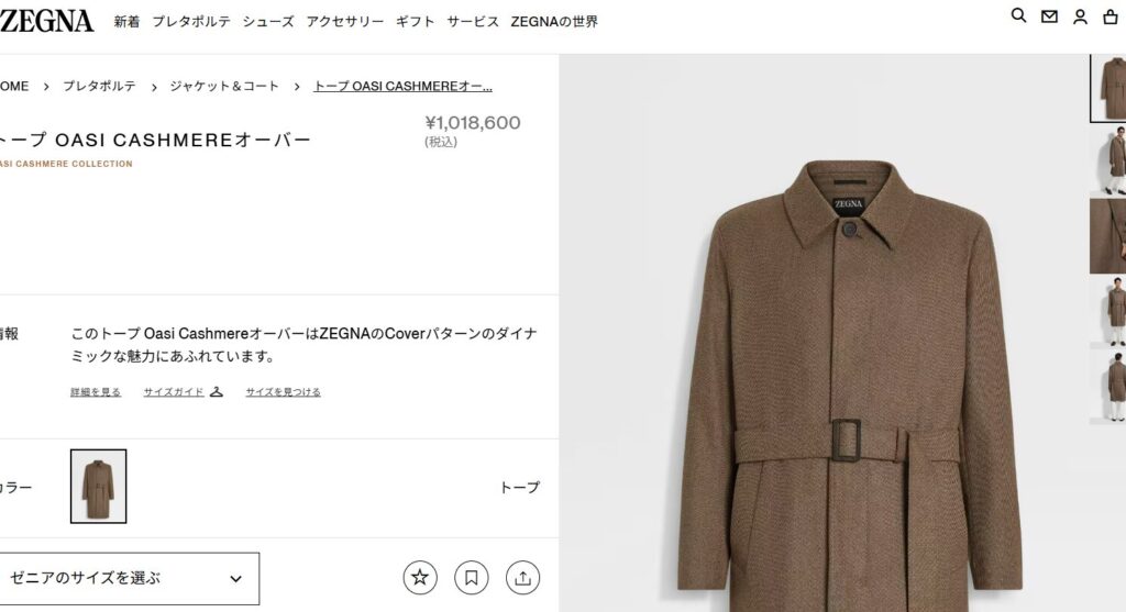 現行のゼニアのカシミヤ100%のコートなら、100万円くらいはするので、それが5万円以下というのは、破格です。