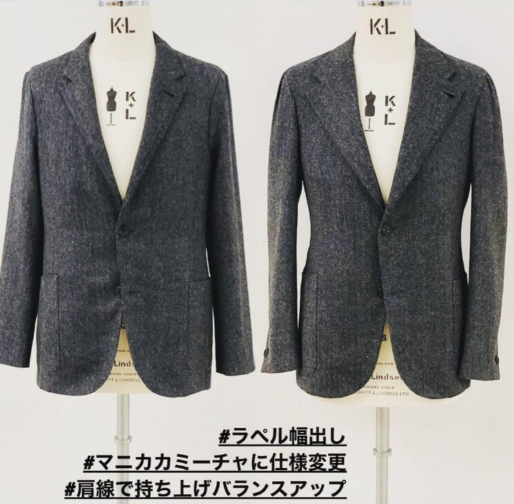 また、具体的にどんなやり方でされたのかは分かりませんが、心斎橋リフォームさんのインスタ投稿にて、ラペル幅を大幅に広げたお直しが紹介されていました。