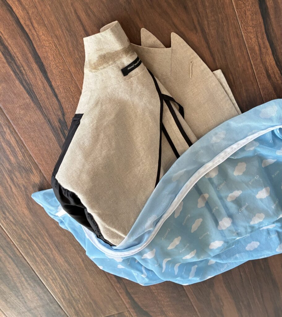 まず、軽く畳んで洗濯ネットに入れます。ジャケットもパンツも、袖と足は裏返しにはしていません。裏返しても良いですが、ドライコースで洗うのでそんなに擦れることもないからです。
