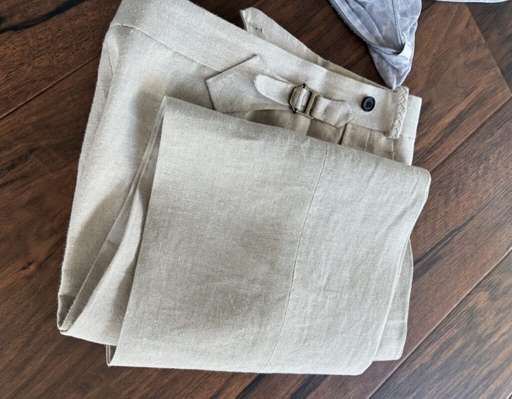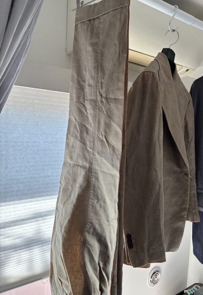 これまで、リネンのジャケットもパンツも、同じように洗濯機で水洗いしたことはあり、今までは全く縮まないか、縮んでも数ミリ程度だったので、今回も大丈夫だろうと油断していました。