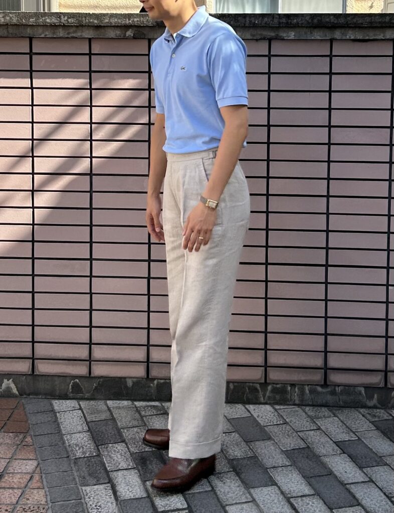 ベルトレスパンツのメリットの一つが、靴とベルトの色合わせを気にしなくて良いことです。