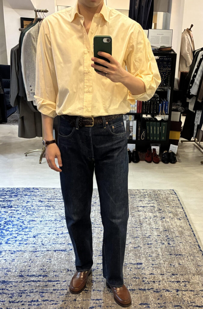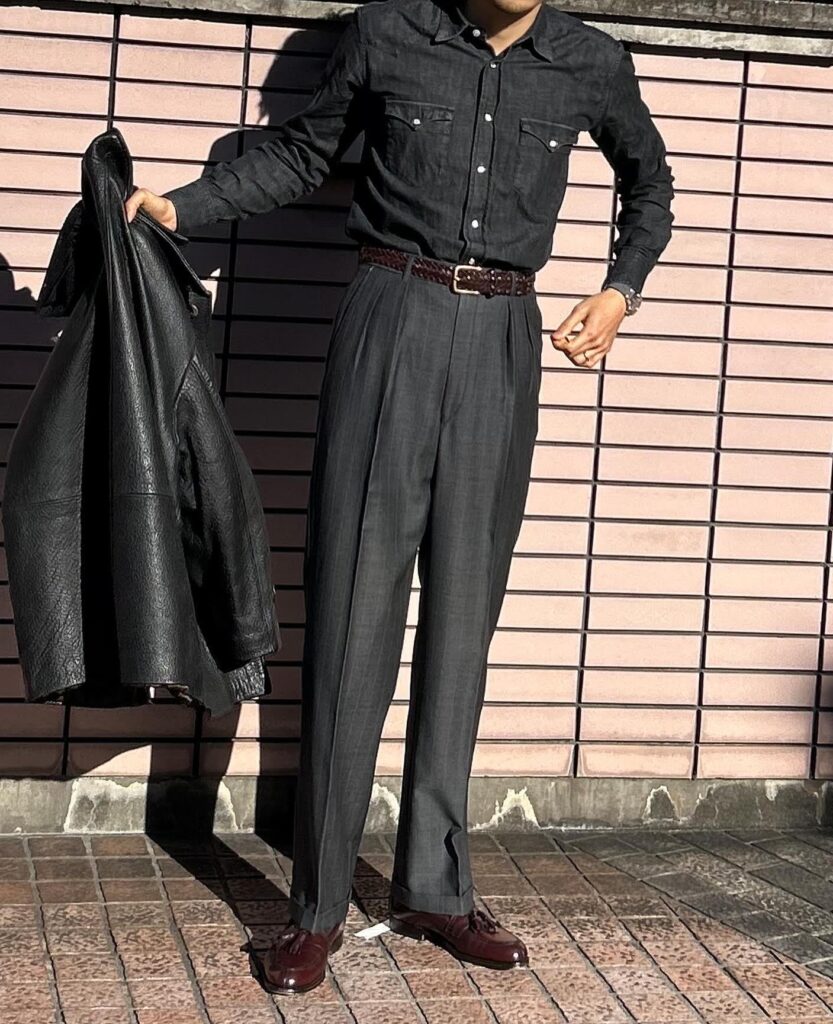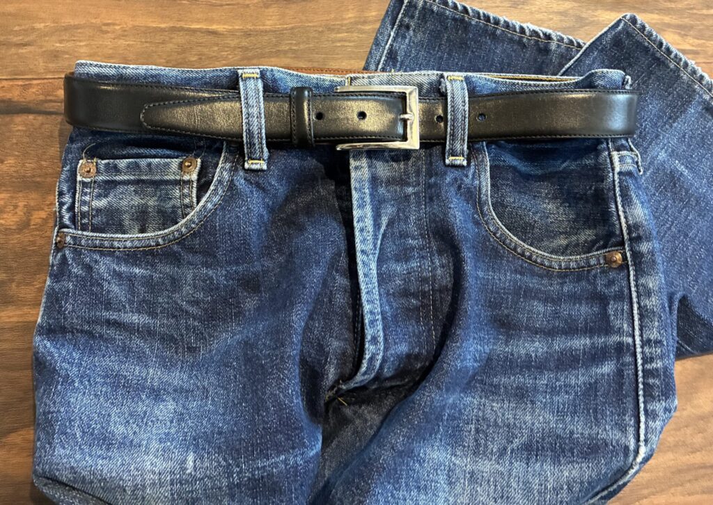 しかし、同じベルトをデニムに付けると、アンバランスです。