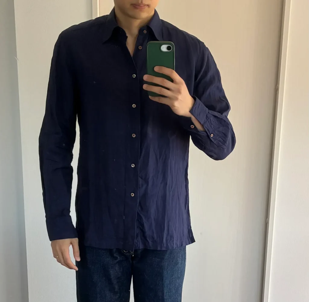 ちなみにやったのはリネンシャツですが、リネンに限らず、第二ボタンを開けたくなるような素材、つまり春夏向け素材に特に向いていると思います。