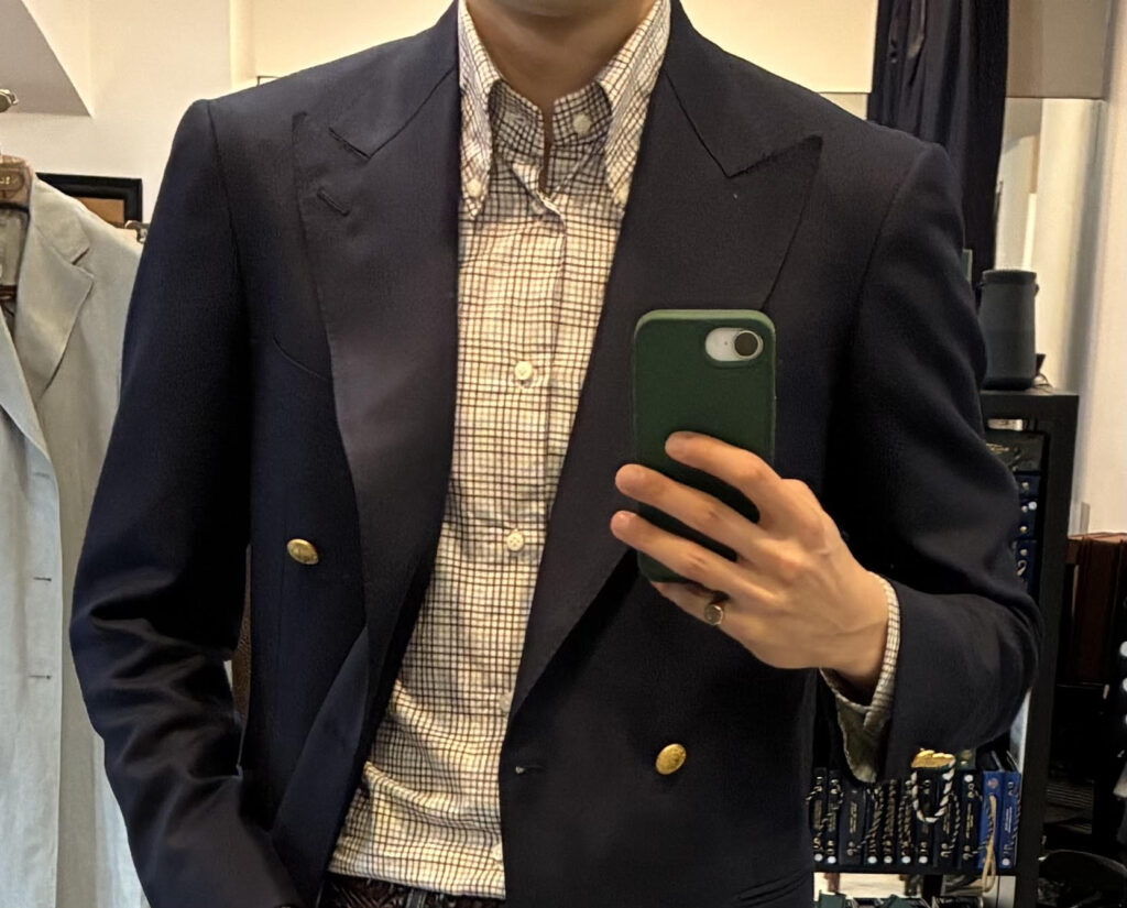もう少し自由度の高いオーダーの場合は、第二ボタン位置は変えず、第三ボタン以下を全て1センチ上げる、というやり方が出来るので、次回はそれを試してみようと思っています。その方が全部のボタン間隔が均等に近づき、見た目のバランスが整うと思うからです。