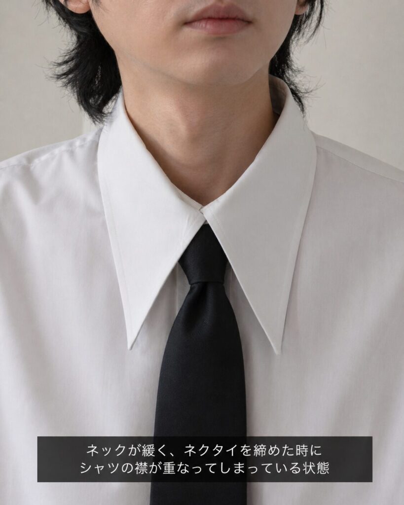 これは試していないので想像ですが、具体的には通常8-9.5㎝くらいの襟先の長さを、10-11㎝とかにすれば効果はあると思います。