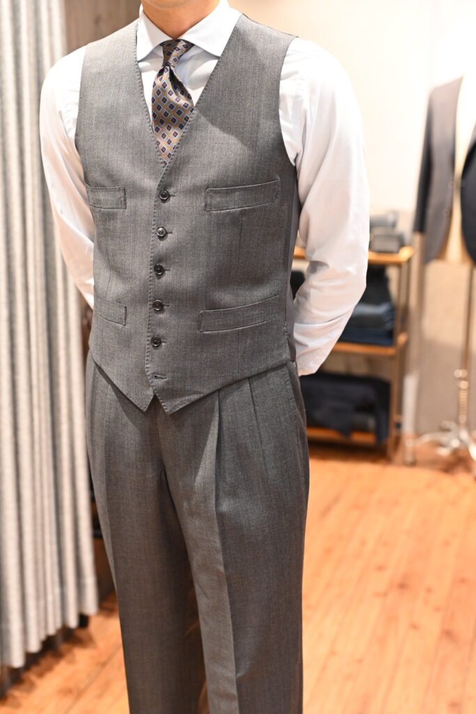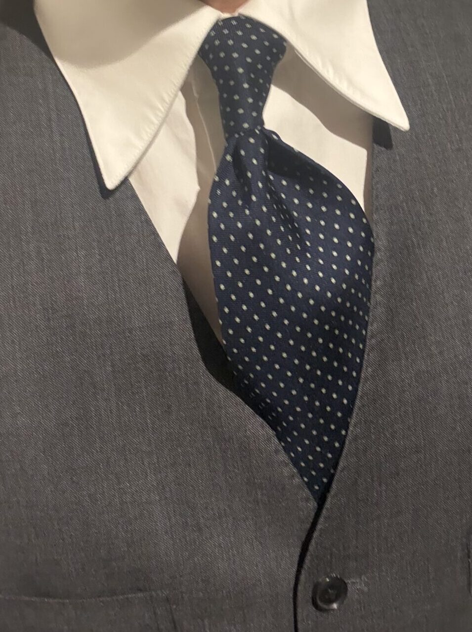 しかし、いざスリーピーススーツに合わせてみると、このように襟先がベストからはみ出てしまうことがありました。
