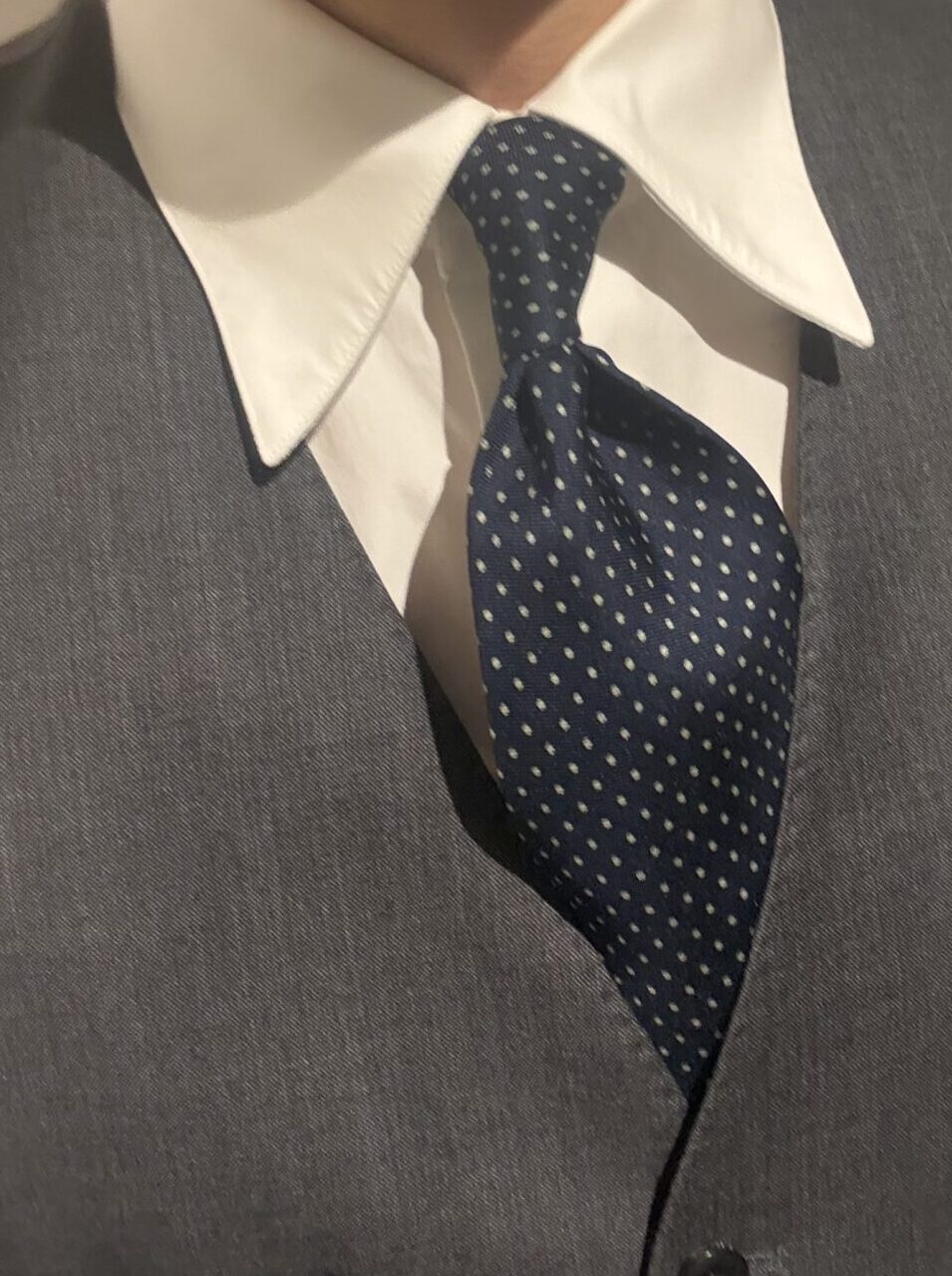 スリーピーススーツを着た時、シャツの襟先が、ジャケットの中には収まっているけど、ベストからははみ出てしまう、という悩みを抱えている方、おられませんでしょうか。