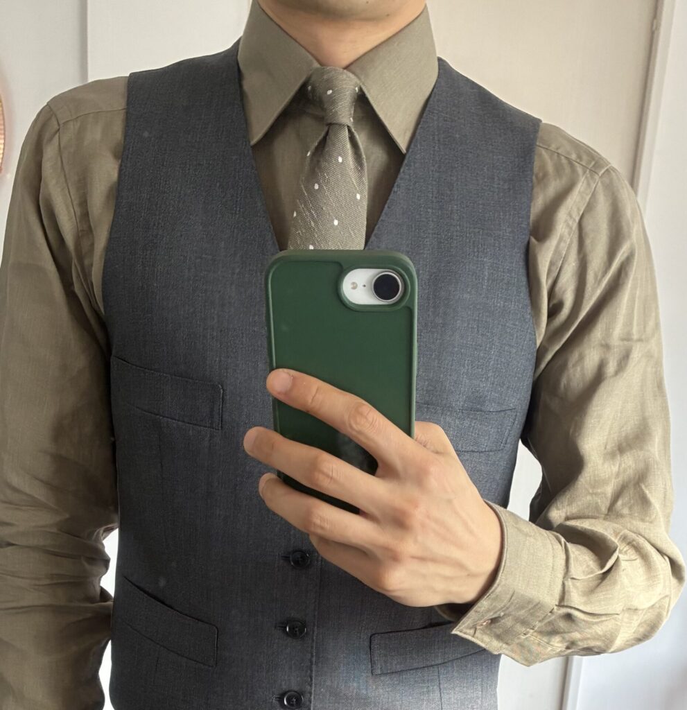 色合わせは気持ち悪いですが、この通りしっかりと襟先がベストの下に収まっています。