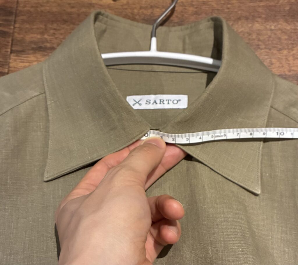 平置きすると襟の開き角度は広めに見えますが、実際は90度くらいの開きで、襟の長さは9.0㎝、タイスペースが1.0㎝です。