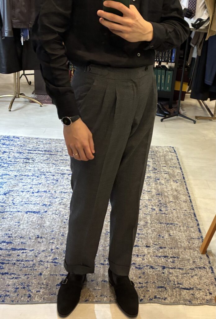 本当はリネンのグレースラックスを履きたかったのですが、今オーダー中で未完成なので、仕方なくウールを履いています。